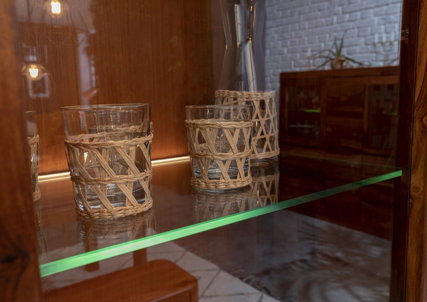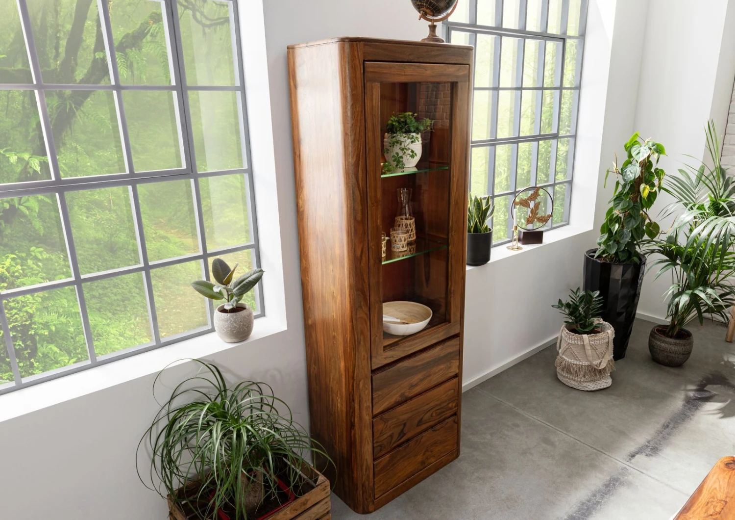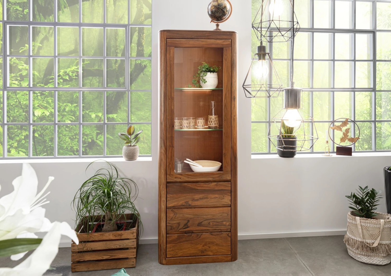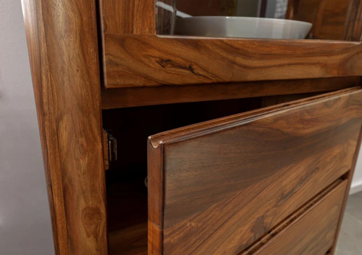 In questa vetrinetta in legno massello di sheesham acacia della linea Toronto, la sezione superiore è sicuramente quella più distintiva e sgargiante. La lunga e sottile cornice trasparente lascia intravedere linterno, cattura e restituisce la luce nella stanza. Tuttavia, uno sguardo più attento svela quella che in realtà è la vera particolarità del mobile. Più in basso, ciò che apparentemente sembrano essere tre cassetti è in realtà un unico sportello visivamente camuffato. Il designer qui si è divertito a giocare con forme e superfici per dare un tocco di brio ad un arredo estremamente semplice. Dettagli a parte, la vetrinetta in legno massello è un felice connubio tra rustico e moderno. Il vivido color noce cerato è infine la suggestiva scia di sfumature cromatiche che resta impressa nella memoria anche dopo aver distolto lo sguardo.