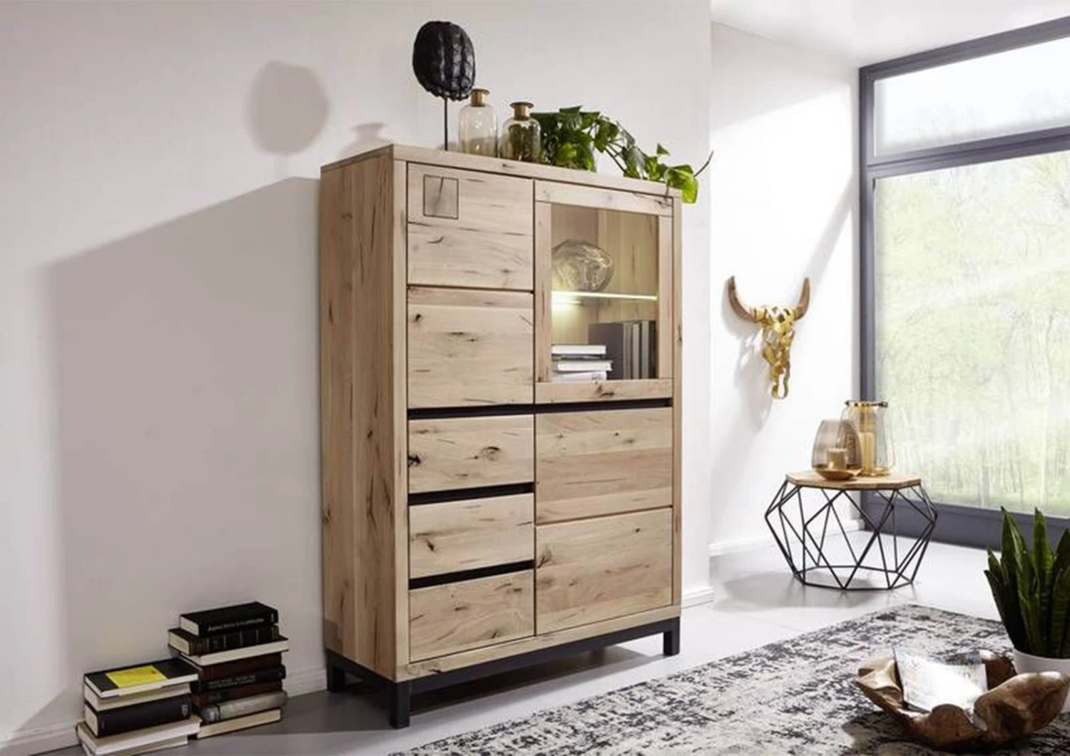 Credenza in legno massello di quercia selvatica, ottima disponibilità e diversificazione degli spazi di archiviazione, colore originale, trattamento ad oliatura, pregiate finiture e suggestive imperfezioni della superficie. La sezione sinistra presenta in basso tre cassetti telescopici con meccanismo a scorrimento fluido soft close, mentre in alto è stato ricavato uno sportello che racchiude due scomparti. La parte di destra della credenza in legno massello ha dimensioni maggiori, così nella zona inferiore è presente unanta cieca con due vani su singola mensola orizzontale. In quella superiore è stata collocata la porticina a vetro con ripiano dello stesso materiale. Su richiesta è possibile installare la retroilluminazione interna, le aperture sono a gola anziché con maniglie, in puro stile moderno.