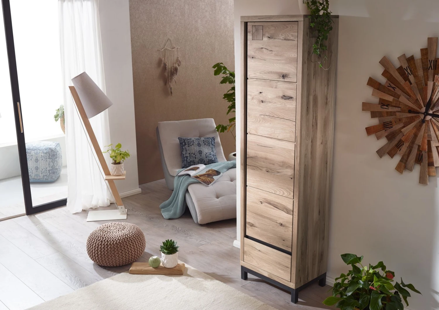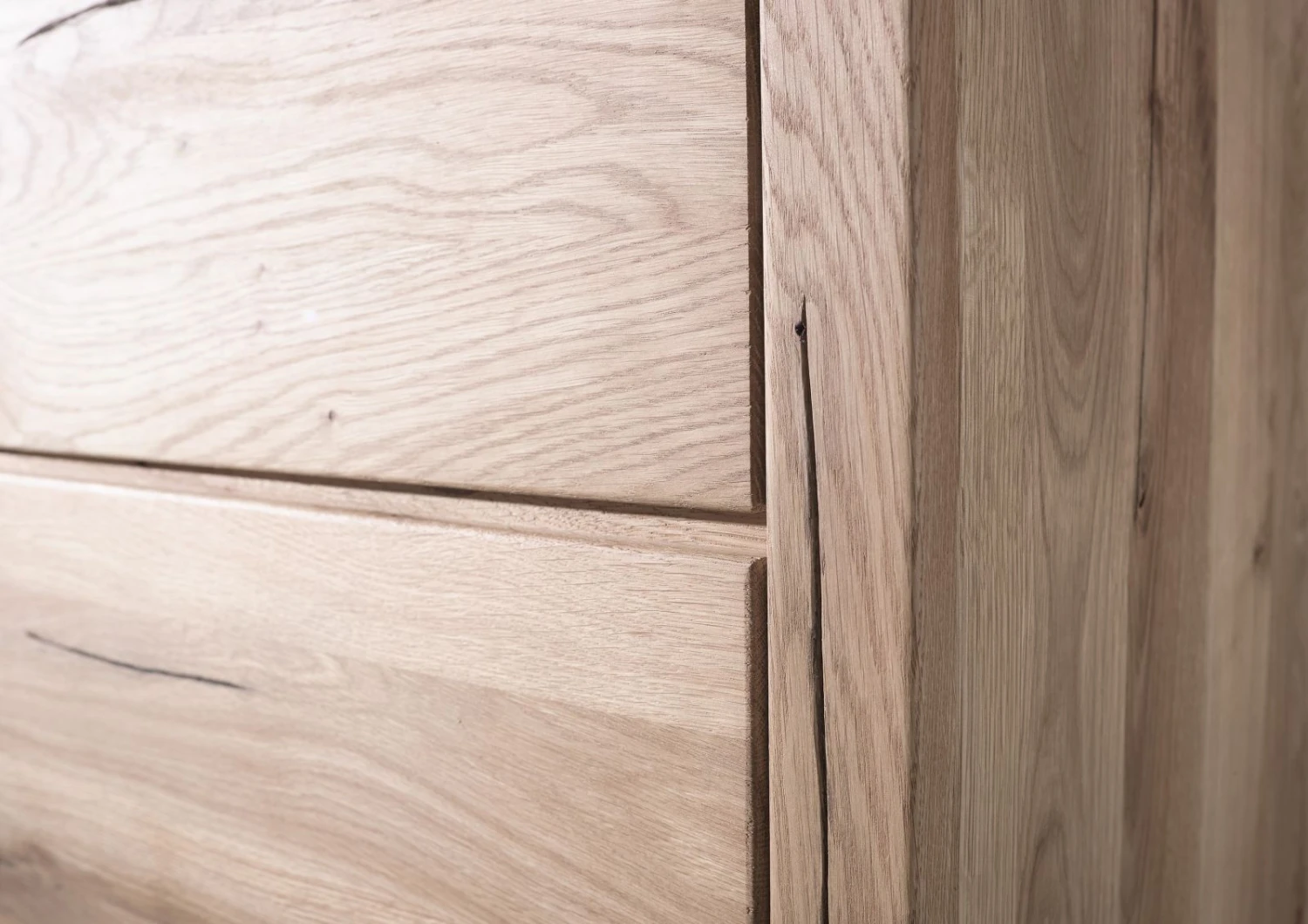Armadio in legno massello di quercia selvatica colore bianco, stile moderno, magnifiche rifiniture e particolari sfumature cromatiche della superficie trattata ad oliatura. La base di supporto e il telaio interno sono fatti in metallo satinato grigio, mentre il resto della struttura è realizzato in caldo e pregiato materiale naturale. Larmadio in legno massello è dotato di un vano guardaroba predisposto con ganci appendi abiti e un piccolo scomparto ricavato da un ripiano nella parte superiore. Il tutto è racchiuso dietro un singolo sportello ad anta con facciata che disegna quattro identiche sezioni geometriche. Nella parte inferiore è presente un cassetto telescopico con meccanismo di scorrimento fluido soft close, i sistemi di apertura sono a gola.