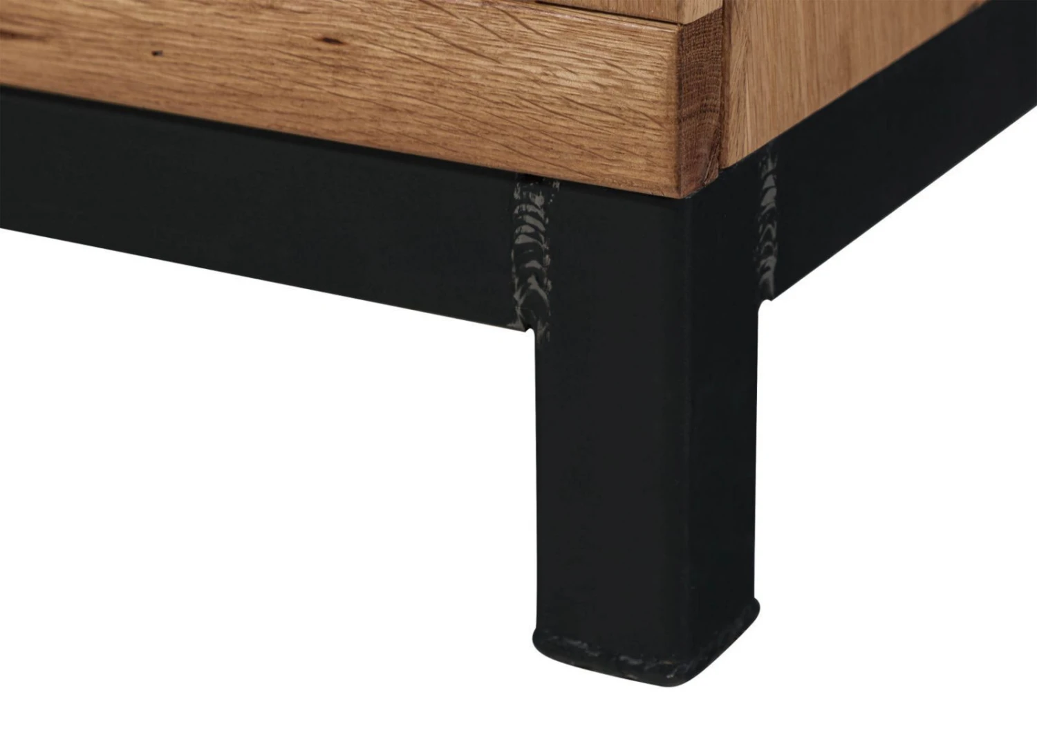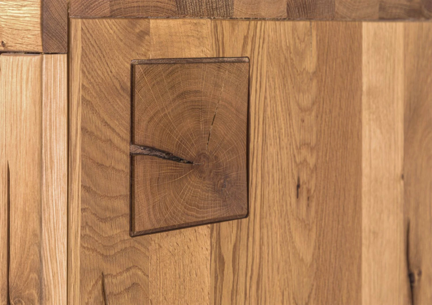 Credenza in legno massello di quercia selvatica,autentiche imperfezioni, discromie e suggestive sfumature della tinta originale, superficie oliata che agevola la pulizia e mantiene il materiale bello nel tempo. Come per altri componenti della stessa collezione anche questo arredo in stile moderno spicca per la fusione di metallo, presente alla base e nella piastra interna di raccordo, con il legno della struttura. La sezione inferiore è composta da due ante gemelle che rivelano un totale di quattro vani di archiviazione, descritti da unasse centrale e una mensola orizzontale. La parte superiore sinistra della credenza in legno massello rispecchia quella in basso, mentre sulla destra lo sportello è a vetro, con due scomparti e un ripiano trasparente. I sistemi di apertura sono a gola e su richiesta e possibile installare la retroilluminazione interna della vetrina.