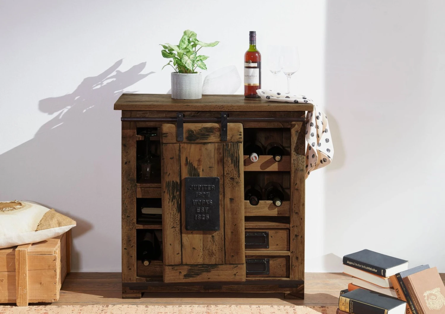 Due cassetti offrono infine spazio per cavatappi, tovaglioli o snack. Pratico e funzionale, il mobile è realizzato in legno massello di mango. In combinazione con elementi in ferro scuro, il robusto legno emana un irresistibile fascino industriale. L’anta scorrevole permette infine di occultare una sezione della composizione rivelandone l’altra.